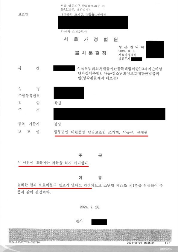재판에서도 A군이 비록 범행을 저질렀지만 범행을 저지른 경위에 참작할 부분이 있다는 점, 충분히 반성을 하고 있는 점, A군의 보호자가 구체적인 선도계획을 갖고 있으며 보호의지 및 보호능력이 충분하다는 점 등 불처분 사유를 중점적으로 주장했습니다.