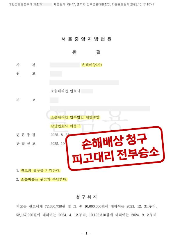 그 결과 재판부는 법무법인 대한중앙의 주장을 모두 인정하고 B씨의 청구를 기각, 소송비용도 모두 부담하도록 하는 판결을 내렸습니다. 의뢰인 A씨와 법무법인 대한중앙의 완전한 승리였습니다.