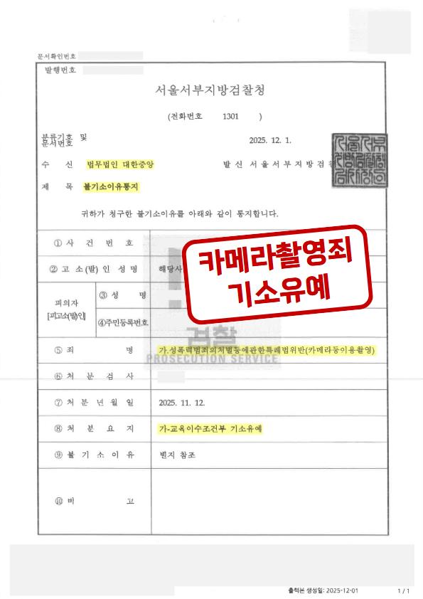 검찰은 법무법인 대한중앙의 주장을 받아들여, 의뢰인에게 ‘교육이수조건부 기소유예’ 처분을 최종 결정했습니다.