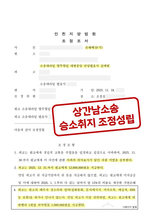 그 결과 재판부는 법무법인 대한중앙의 주장을 모두 인용하였습니다. 이에 A씨는 사과와 위자료를 받을 뿐 아니라 앞으로의 관계까지 깨끗이 청산하도록 할 수 있었습니다.